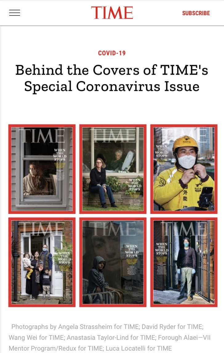 《时代》杂志这一期主要围绕这新型冠状病毒展开,此次上线了六种不同的封面,每种封面上都是收到新冠病毒疫情影响的人物肖像,范围从华盛顿的生活护理中心,到德黑兰的阳台再到中国国内的街道。