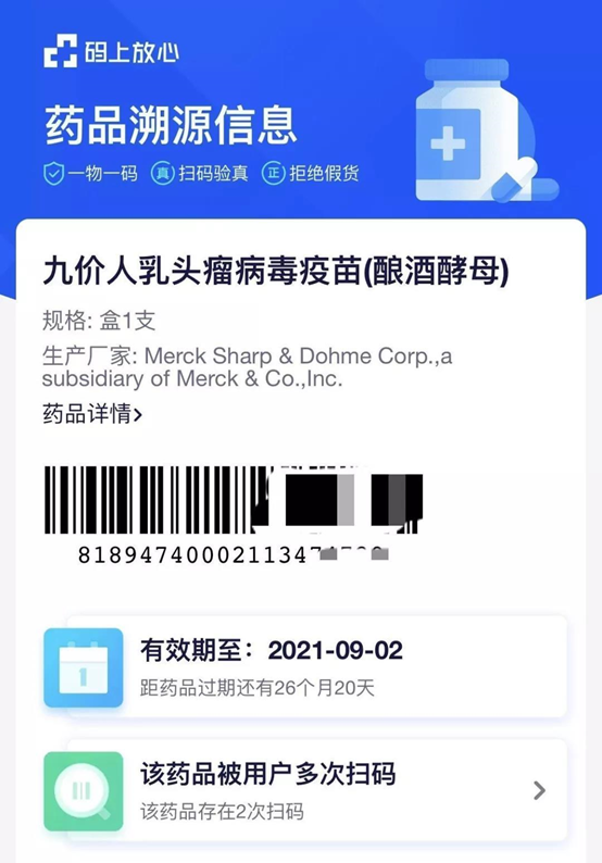 图为扫描条形码显示的药品追溯信息(图片来源:支付宝App截图)