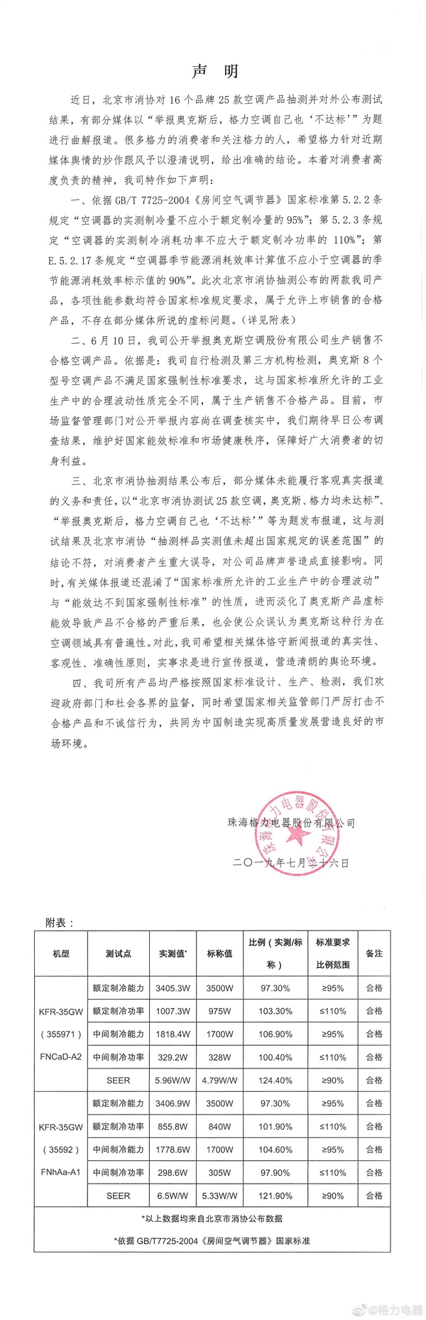 三、北京市消协抽测结果公布后,部分媒体未能履行客观真实报道的义务和责任,以“北京市消协测试25款空调,奥克斯、格力均未达标”、“举报奧克斯后,格力空调自己也‘不达标’”等为题发布报道,这与测试结果及北京市消协“抽测样品实测值未超出国家规定的误差范围”的结论不符,对消费者产生重大误导,对公司品牌声誉造成直接影响。同时,有关媒体报道还混淆了“国家标准所允许的工业生产中的合理波动”与“能效达不到国家强制性标准”的性质,进而淡化了奥克斯产品虚标能效导致产品不合格的严重后果,也会使公众误认为奥克斯这种行为在空调领域具有普遍性。对此,我司希望相关媒体恪守新闻报道的真实性、客观性、准确性原则,实事求是进行宣传报道,营造清朗的舆论环境。