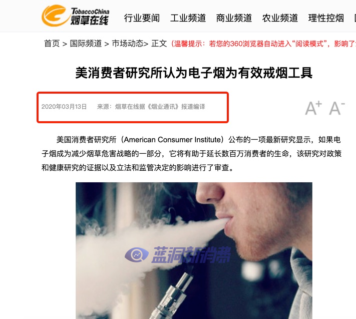 点开之后,文章和蓝洞,烟草在线,以及原始英文报道烟业通讯内容完全一致,由此可以看出,朋友圈流传的烟草专卖局官网转载电子烟是有效戒烟工具文章属实。这篇文章地址在这里。
