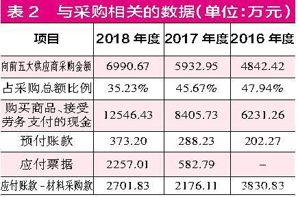 在现金流量表中,2018年其“购买商品、接受劳务支付的现金”的金额为1.25亿元,其中应剔除预付款项增加额84.97万元,再与含税采购金额勾稽后差额达1.06亿元,这也就意味着,理论上应有1.06亿元未支付的采购金额应体现为经营性负债。