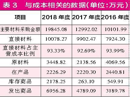 招股书披露,2018年其当期原材料采购总额为1.98亿元(如表3),根据财务一般原则,材料采购总额除需要结转到营业成本部分,余下未结转的部分则会留存在存货中,导致存货规模增加。2018年,其主营业务成本中直接材料金额为1.01亿元,占比93.33%,将原材料采购总额与直接材料成本数据对比后,可推测出其有9766.81万元的原材料因未完成加工、生产、销售,而计入存货项目中,理论上应体现为相应规模存货相关项目的增加。