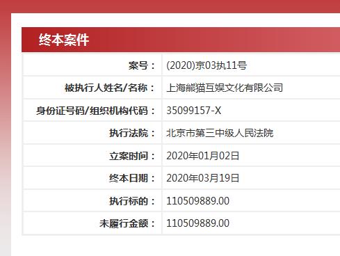 炣燃科技3月24日讯(江丞华) 3月23日,有媒体报道称,熊猫互娱的运营主体上海熊猫互娱文化有限公司新增终本案件1项,终本日期为2020年3月19日,立案日期为2020年1月2日,执行标的为110509889,执行法院为北京市第三中级人民法院。