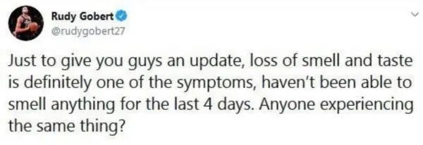 另据中国青年网报道,NBA第一位确诊病例鲁迪·戈贝尔,也出现了味觉和嗅觉异常的症状。戈贝尔目前一直处于隔离治疗的阶段,他表示自己在过去4天时间的味觉和嗅觉都已经出现异常。