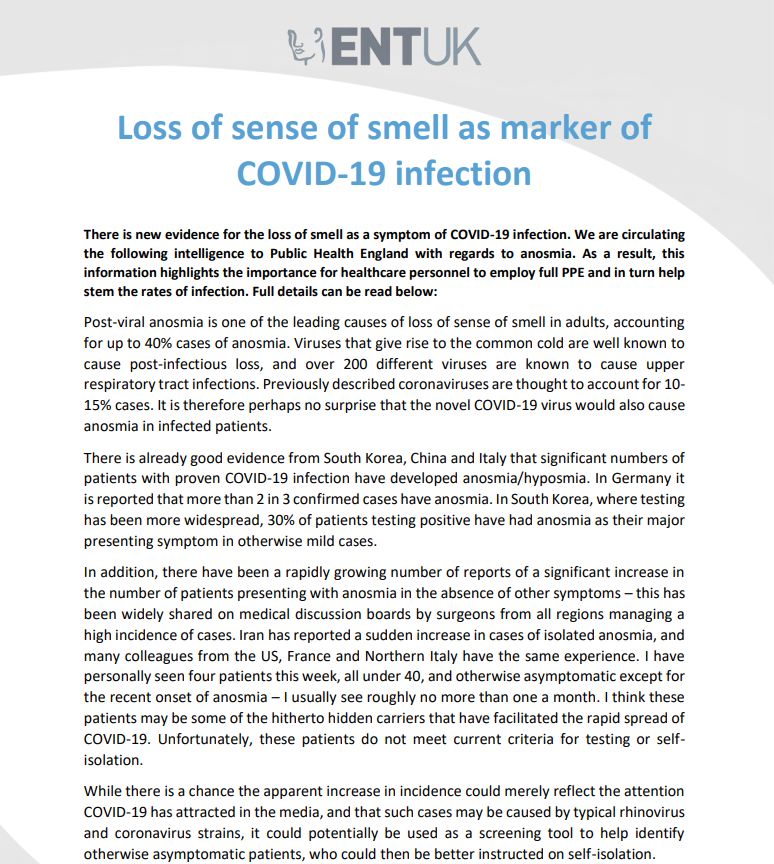 有科学家在英国耳鼻喉科协会官网上发布联合声明称,有新的证据表明嗅觉丧失是新冠肺炎感染的症状之一。图据ENT UK官网