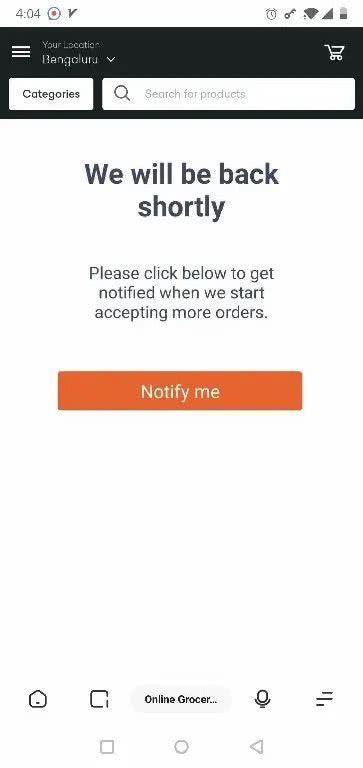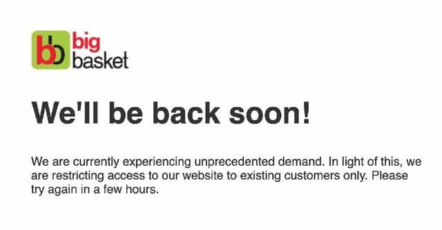 今天,志象网(The Passage)尝试使用多个印度生鲜电商app进行订货,发现都有不同程度的送货时间延迟和缺货的情况。BigBasket在上午还可以打开,定位班加罗尔时,可以看到大部分蔬菜肉蛋都有货,但预计送达时间排到了4天后,德里地区则直接显示“无预计送达时间”。下午时,BigBasket的网站和app都显示需求过载,暂时停止服务。软银投资的杂货电商Grofers的网站和app也显示了类似的信息。