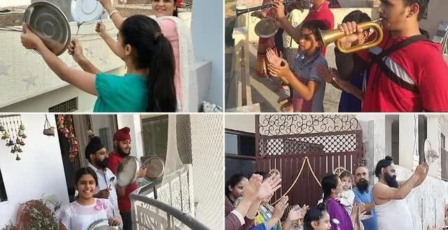 2月23日下午5点,印度人们在窗台敲锣打鼓和鼓掌图片来源:fivetoshine