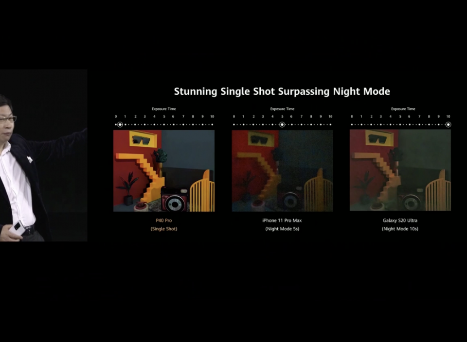 余承东对比了华为P40 Pro和iPhone 11 Pro Max以及Galaxy S20 Ultra在弱光情况下成像。图片显示,其他两家漆黑一片,而华为的图像清晰可见,即使友商调教到暗光模式,成像效果也不如华为P40 Pro。不仅在成像方面,余承东还对比了夜景视频,华为P40 Pro同样“吊打”了苹果和三星。