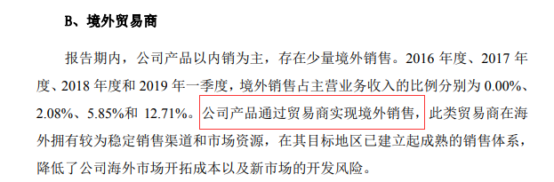 易瑞生物在2019年6月曾提交的招股书(申报稿),其中披露:公司产品的海外销售主要是通过贸易商实现,“此类贸易商在海外拥有较为稳定的销售渠道和市场资源,在其目标地区已建立起成熟的销售体系,降低了公司海外市场开拓成本以及新市场的开发风险”。