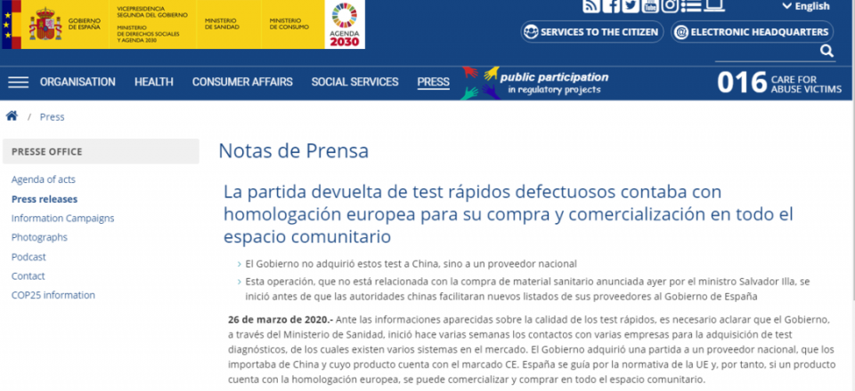 图上文字显示:西班牙政府不是从中国购买的检测试剂,而是从一家西班牙当地供应商处购买的。