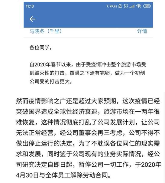 据报道,无疆酒店董事长马晓东在内部信中表示,作为一个初创公司,此次疫情对该公司的打击相对更大,并且打乱了公司的发展计划,为此,不得不做出停止运行的决定。