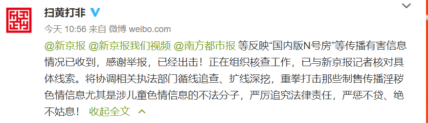 据全国“扫黄打非”办公室官方微博28日上午消息,“扫黄打非”办回应多家媒体反映的“国内版N号房”等传播有害信息情况称,已经出击,正在组织核查工作。