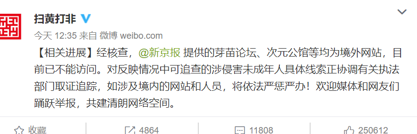28日中午,“扫黄打非”办公室官方微博更新消息表示,芽苗论坛、次元公馆等均为境外网站,目前已不能访问。对反映情况中可追查的涉侵害未成年人具体线索正协调有关执法部门取证追踪,如涉及境内的网站和人员,将依法严惩严办!欢迎媒体和网友们踊跃举报,共建清朗网络空间。