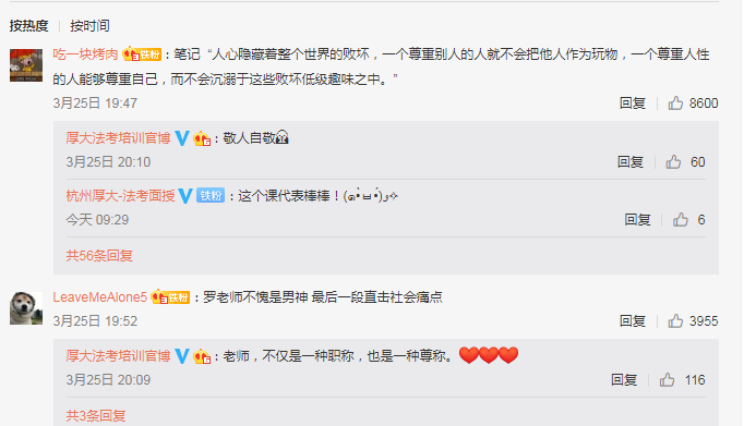 现任中国政法大学刑事司法学院刑法学研究所所长罗翔教授,一直是中国政法大学最受欢迎的老师之一。因其风趣活泼的讲课风格而走红网络,3月9日进驻B站以后,短短半个月就拥有了超过300万粉丝。