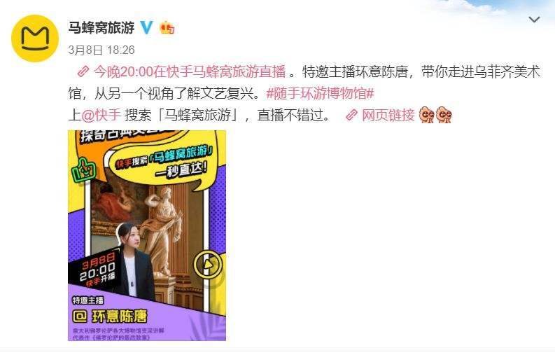 针对直播,从2月中旬开始,马蜂窝围绕博物馆、国内外著名景区开启了“云旅游”直播。那些原本要通过乘飞机、住酒店实现的活动在可行范围内被搬到了线上,在马蜂窝旅游App上还出现了直播频道,每天三至十场云旅游直播,内容涵盖境内外上百个目的地、景点,包括路线推荐、旅行必备品、景点讲解、拍照攻略,等等。