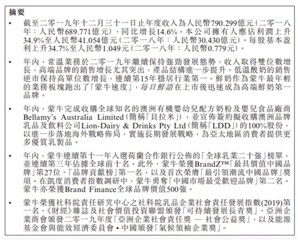 3月26日,蒙牛乳业发布的财报显示,2019年,蒙牛乳业实现营业收入达790亿元,同比增长14.6%;归属于上市公司股东净利润达41亿元,同比增长34.9%;每股盈利1.049元,同比增长34.7%。据了解,2018年,蒙牛乳业营收为689.77亿元,归属于上市公司股东净利润为30.43亿元。