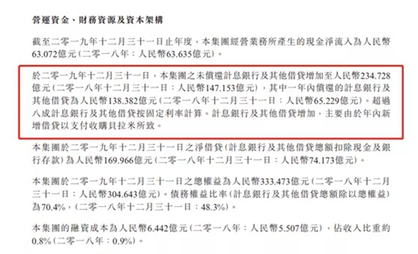 资本观察网注意到,截至2019年12月31日,蒙牛乳业未偿还计息银行及其他借贷增加至人民币234.73亿元,其中一年内偿还的计息银行及其他借贷为人民币138.38亿元。据了解,2018年蒙牛乳业之未偿还计息银行及其他借贷为147.15亿元。