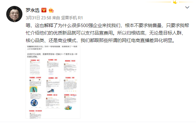 当然了,一些网友开始质疑罗永浩,认为上述不少商品,可能他并不能真正的给带起来,对此罗永浩回应称,很多500强企业来找他们,根本不要求销售量,只要求他帮忙介绍他们的优质新品就可以支付品宣费用。所以归根结底,无论是目标人群、核心品类、还是商业模式,我们都跟那些所谓的网红电商直播差异化明显。