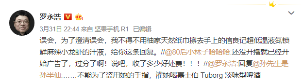 老罗还指出,“直播室就是卖场,卖什么产品都可能。小米有品商城,将来也会卖我们做的东西。目前没有计划去任何地方打工,将来如果有需要,打工也没有什么。[微笑] 另外,一些媒体总说我骂过很多手机厂商,但我公开赞扬过很多手机厂商的产品,他们就选择性失忆了。”