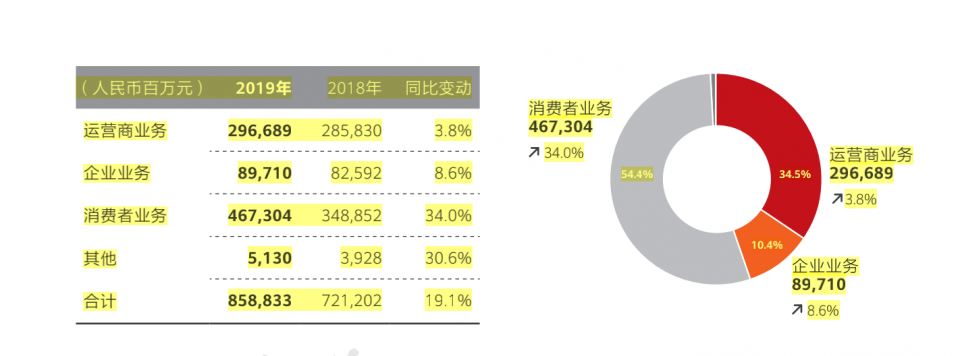 从具体业务来看,2019年华为运营商业务营收2966.89亿元,同比增长了3.8%,营收占比34.5%;华为消费者业务营收4673.04亿元,同比增长了34.0%,营收占比54.4%,首次超过了50%;企业业务营收825.92亿元,营收占比10.4%。