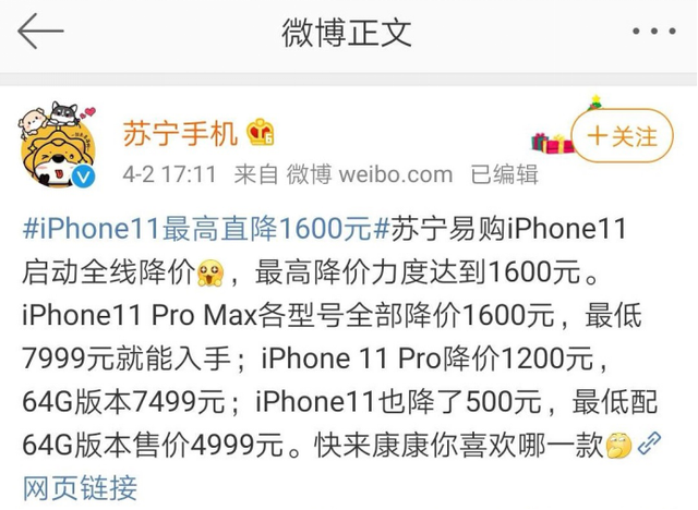 周四(4月2日),苏宁手机官方微博发文,宣布iPhone11启动全面降价。根据内容显示,本轮最大降幅高达1600元。