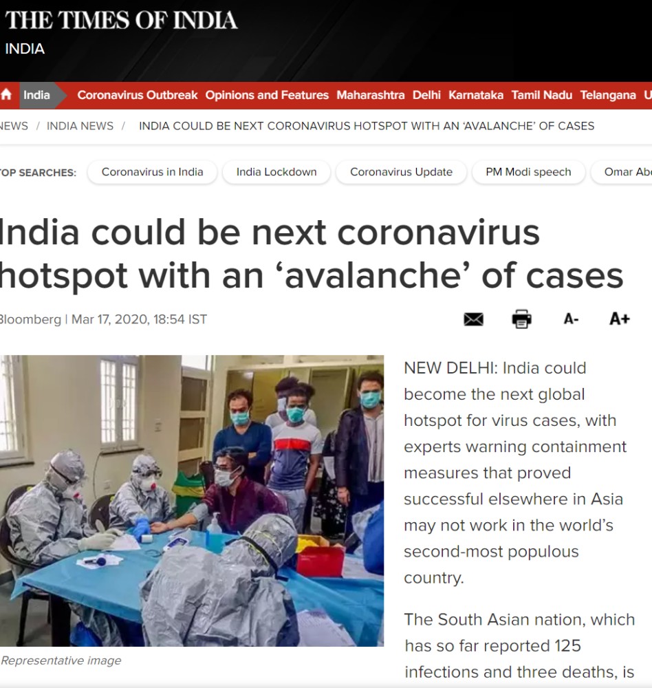 (印度医学研究理事会病毒学研究中心前负责人雅格·约翰发出警告:“印度可能成为全球疫情的下一个爆点。” 来源:印度时报)