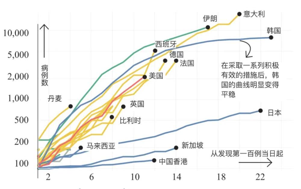 (图为全球各国家和地区从发现第100例病例后的趋势变化。可以看出,韩国在采取一系列积极措施后,增长曲线被明显“压了下来”。来源:《印度教徒报》官网)