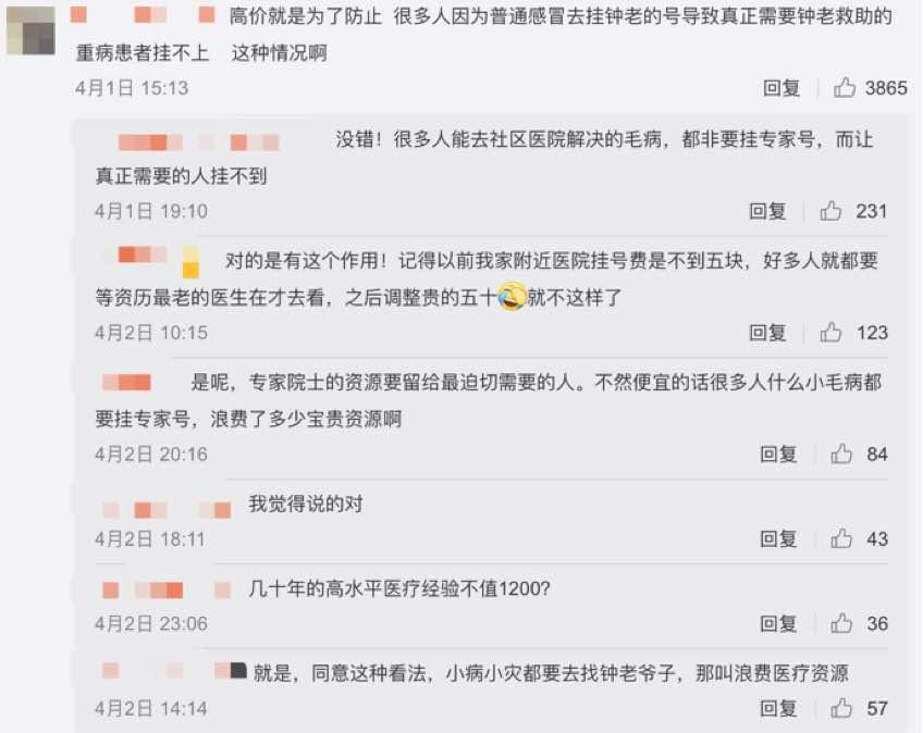 网友表示,首先作为行业领域内的专家,钟院士有着几十年的高水平的医疗经验,而且已经84岁高龄的他仍在坚持出门诊,就其本身而言,1200的挂号费并不贵;其次,挂钟院士号的人,必然是疑难杂症,而非普通的呼吸疾病,如果定价低,很容易造成无论大小疾病都找到钟院士,造成专家资源严重浪费。