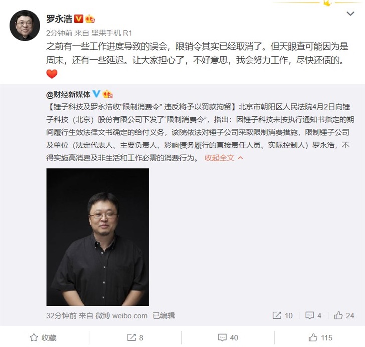 对此罗永浩刚刚在微博回应称,之前有一些工作进度导致的误会,限销令其实已经取消了。但天眼查可能因为是周末,还有一些延迟,“让大家担心了,不好意思,我会努力工作,尽快还债的。”