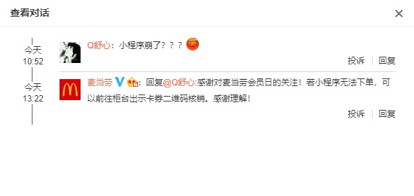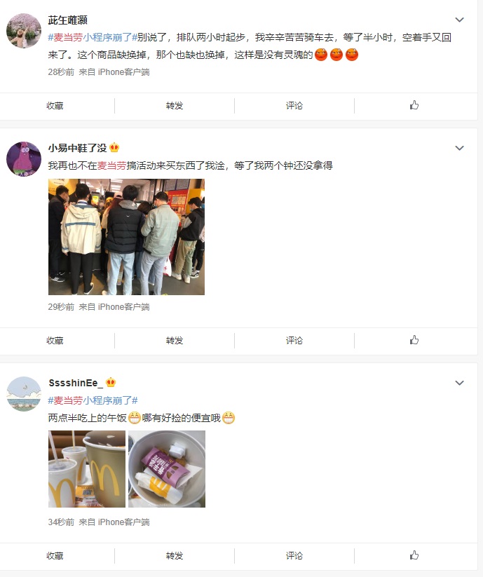 商业 麦当劳39元半价桶太火爆:小程序崩溃,线下排大长队 2020-04-07 09:18:16 分享 来源:IT之家4月6日消息,据IT之家网友反馈,今天麦当劳微信小程序崩溃了。原来今天是麦当劳会员日,此前特别推出的39元半价金桶优惠券仅限4月6日当天可以使用,大量消费者前往麦当劳小程序点餐造成访问量巨大而崩溃。IT之家获悉,对此今天下午,麦当劳在微博表示,感谢对麦当劳会员日的关注!若小程序无法下单,可以前往柜台出示卡券二维码核销。感谢理解!不过这似乎并没有很好的解决问题,因为不少用户发现小程序崩溃后,已经前往麦当劳线下门店取餐,结果发现还是要排长队,造成大量人员扎堆聚集。