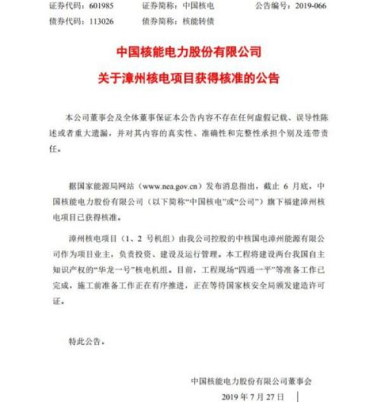 炣燃科技7月26日讯 7月27日,中国核能(601985.SH)发布正式公告称,目前,漳州核电项目已获得核准,正在进行施工前准备工作。