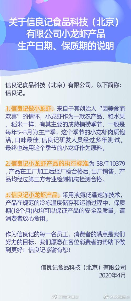 商业 罗永浩带货的小龙虾是去年6月的:商家借机清库存? 2020-04-09 09:54:49 分享 来源: 中国新闻网近日,罗永浩直播带货的信良记小龙虾火了。不过,有网友反映,“还没收到货”,“吃了拉肚子”,“一看生产日期是去年6月份的”,“虽然没过期,但不敢吃了”。对此,信良记称,全公司都去发货了,货在路上的朋友请耐心等待。小龙虾保质期是18个月,保质期内均可保证产品安全及质量,请消费者放心食用。你敢吃吗?