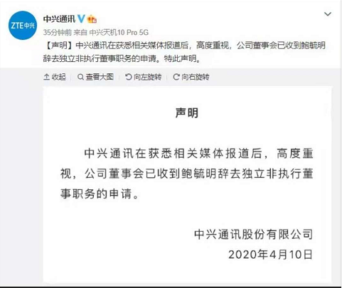 炣燃科技4月10日讯(江丞华) 4月10日6点,中兴通讯在其官方微博发布声明表示,该公司在获悉相关媒体报道后,高度重视,公司董事会已收到鲍毓明辞去独立非执行董事职务的申请。