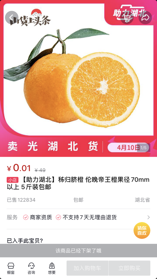 据悉,该秭归春橙以1分钱5斤的包邮价格出售,每人限购一份,当场秒没,截止记者发稿,共售出12万份。而当时直播人数也瞬间多了近20万人。