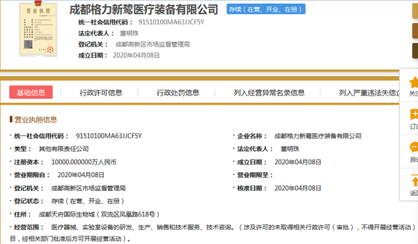 4月11日,有媒体报道称,董明珠新成立了成都格力新鹭医疗装备有限公司,据国家企业信用信息公示系统显示,该公司成立时间为2020年4月8日,法定代表人为董明珠,其经营范围为:医疗器械、实验室设备的研发、生产、销售和技术服务、技术咨询。