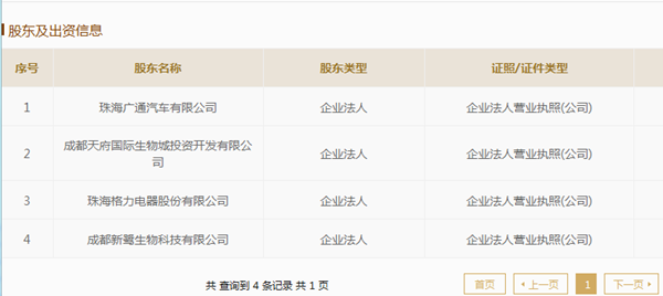 其中,成都格力新鹭公司股东共有4个,分别是珠海格力电器、成都新鹭生物科技有限公司、珠海广通汽车与成都天府国际生物城投资开发有限公司,其认缴额分别为7500万元、1000万元、500万元和1000万元。