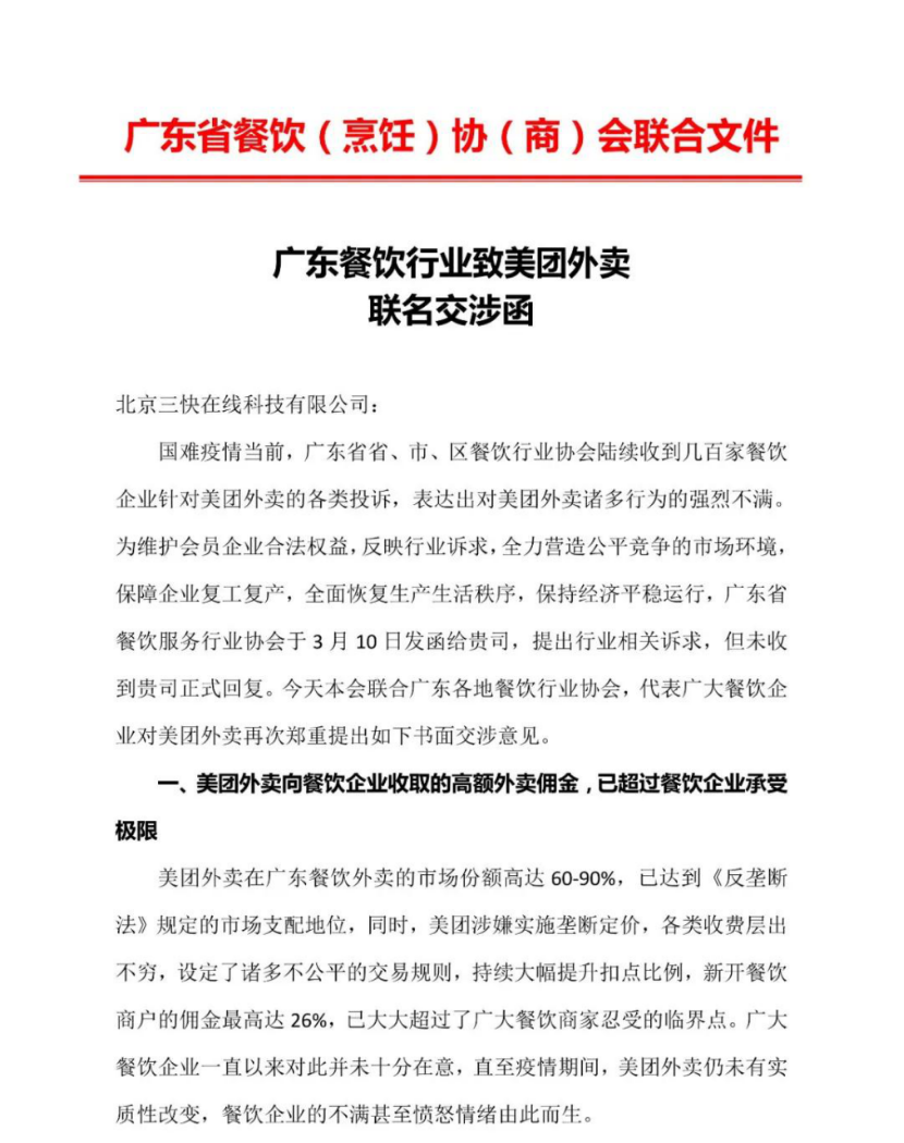有媒体统计显示,包括重庆市工商联餐饮商会、四川省南充市火锅协会、云南省22万余家餐企、山东省饭店协会、山东省老字号企业协会、山东省火锅餐饮协会、山东省团餐行业协会等机构及企业都在今年2月份对美团提高佣金、垄断经营等问题提出抗议,直言“现行外卖佣金费率较高,让餐企苦不堪言、雪上加霜”。