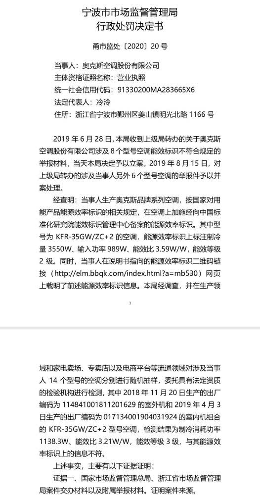炣燃科技4月12日讯(锦江) 宁波市市场监督管理局10日对奥克斯空调股份有限公司利用能源效率标识进行虚假宣传一案,作出“责令改正”和“处罚款10万元人民币”的行政处罚决定。