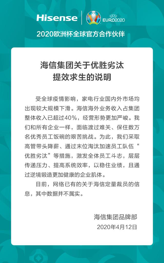“为此,我们采取高管带头降薪、通过末位淘汰加速员工队伍“优胜劣汰”等措施,激发全体员工斗志,层层传递压力,提高系统效率,以稳住业绩。”海信集团在申明中如是说。