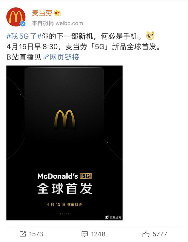 炣燃科技4月15日讯(锦江) 4月13日,麦当劳中国官方微博发布消息称,麦当劳将发布5G新品,全球首发。并配文称"你的下一部新机,何必是手机"。