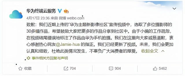 4月18日消息 昨日晚间华为终端云服务官方发文针对近期上传的宣传视频中出现的错误致歉。