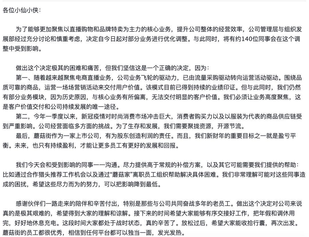 36氪从多位接近蘑菇街人士处了解到,蘑菇街已于4月17日向全体员工宣布新一轮裁员计划。36氪获得的一份由蘑菇街创始人陈琪发给全体员工的内部信显示,本轮裁员人数达140人,蘑菇街方面对36氪称,目前公司员工1000人左右,其中300人为丽水客服。据此计算,该轮裁员比例为14%。