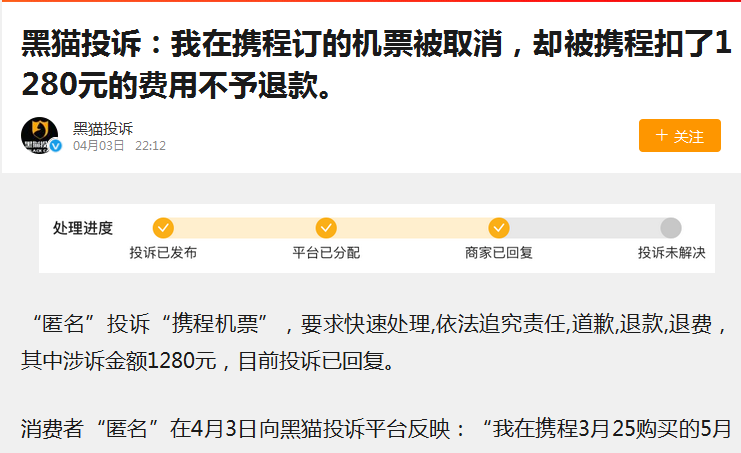 炣燃科技4月20日讯(江丞华)4月19日,有媒体报道称,针对因航班取消而导致的退票,携程方面存在任意收取退票手续费的行为。