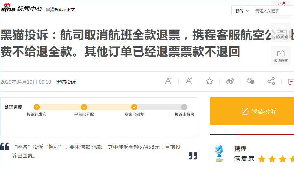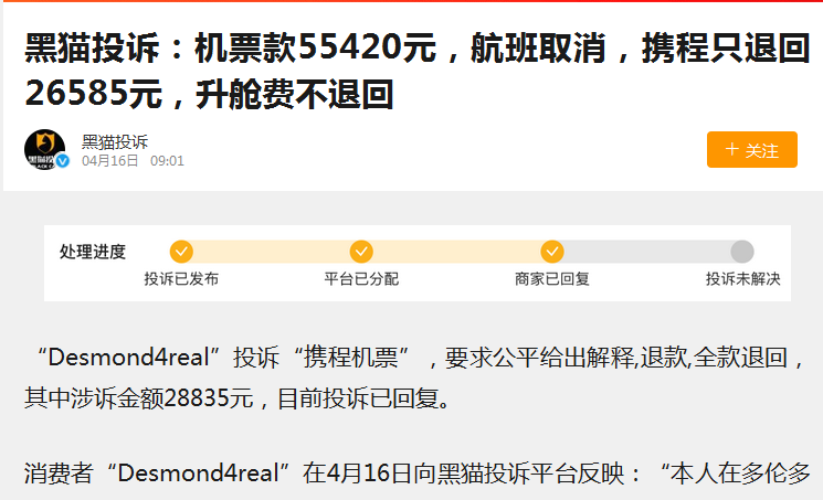 值得关注的是,有用户在投诉中表示,携程扣费的说法与航空公司的回复出现了内容冲突。