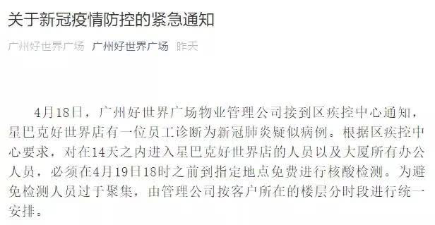 据报道,好世界广场位于广州闹市区,周边人流密集,据当地疾控中心要求,在14天之内进入该星巴克门店的人员以及大厦所有办公人员,必须在4月19日18时之前到指定地点免费进行核酸检测。