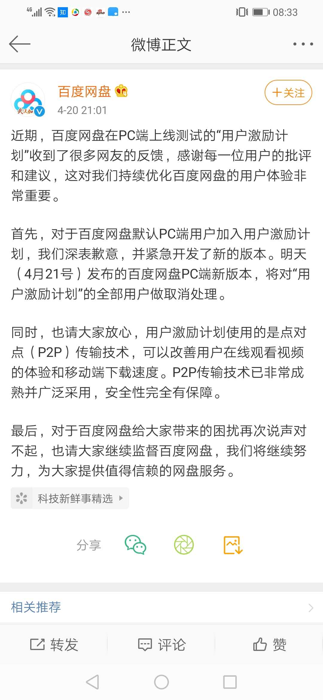炣燃科技4月21日讯(江丞华) 4月20日,针对默认PC端用户加入用户激励计划,百度网盘通过其官方微博发文致歉,并表示,新版本于21日(今天)发布,将对“用户激励计划”的全部用户做取消处理。