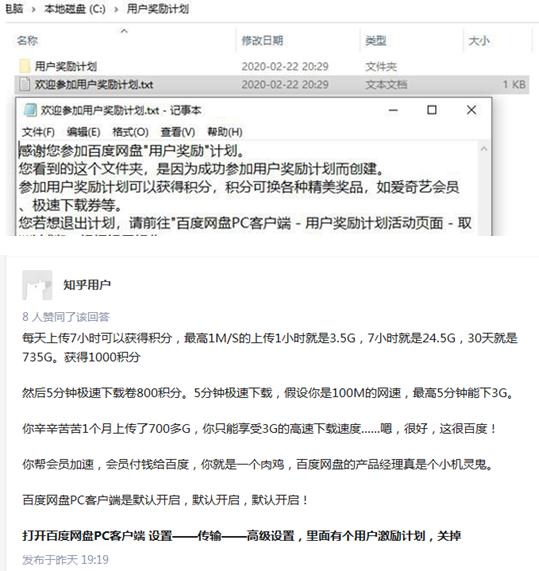 公开资料显示,“用户奖励计划”是百度网盘为存储空间,为网盘传输速度贡献一份力量,同时你也会得到相应的提升传输体验推出的一项活动。活动设计为用户分享的少量闲置网络带宽以及电脑积分奖励,积分可以兑换爱奇艺VIP月卡,极速下载券等奖品。