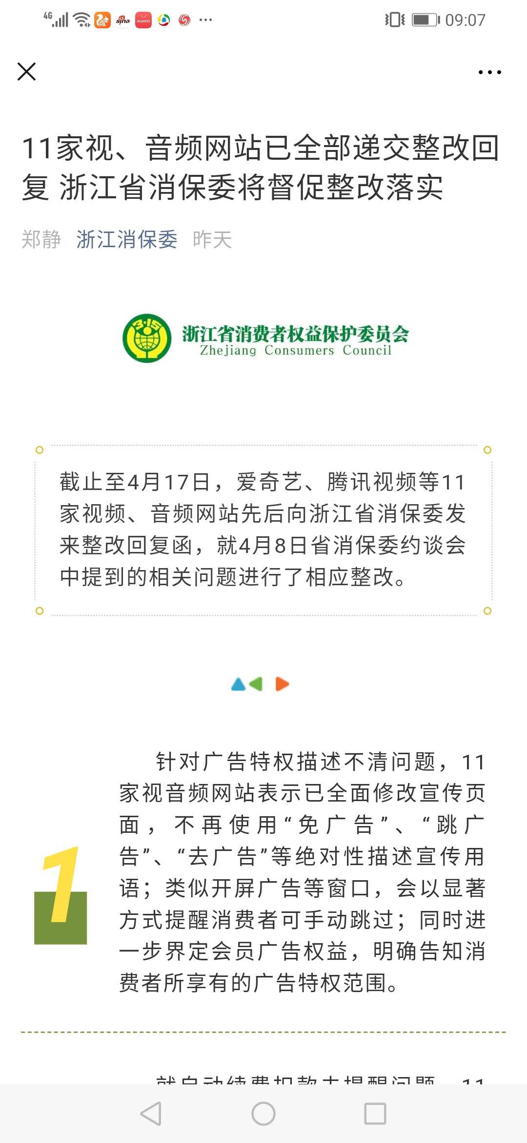 炣燃科技4月21日讯(江丞华) 4月20日,浙江消保委通过其官方微信公众号发文表示,截至4月17日,爱奇艺、腾讯视频等11家视频、音频网站向浙江消保委发整改回复函表示,网站中关于自动续费和针对广告特权描述不清的问题已全面整改。