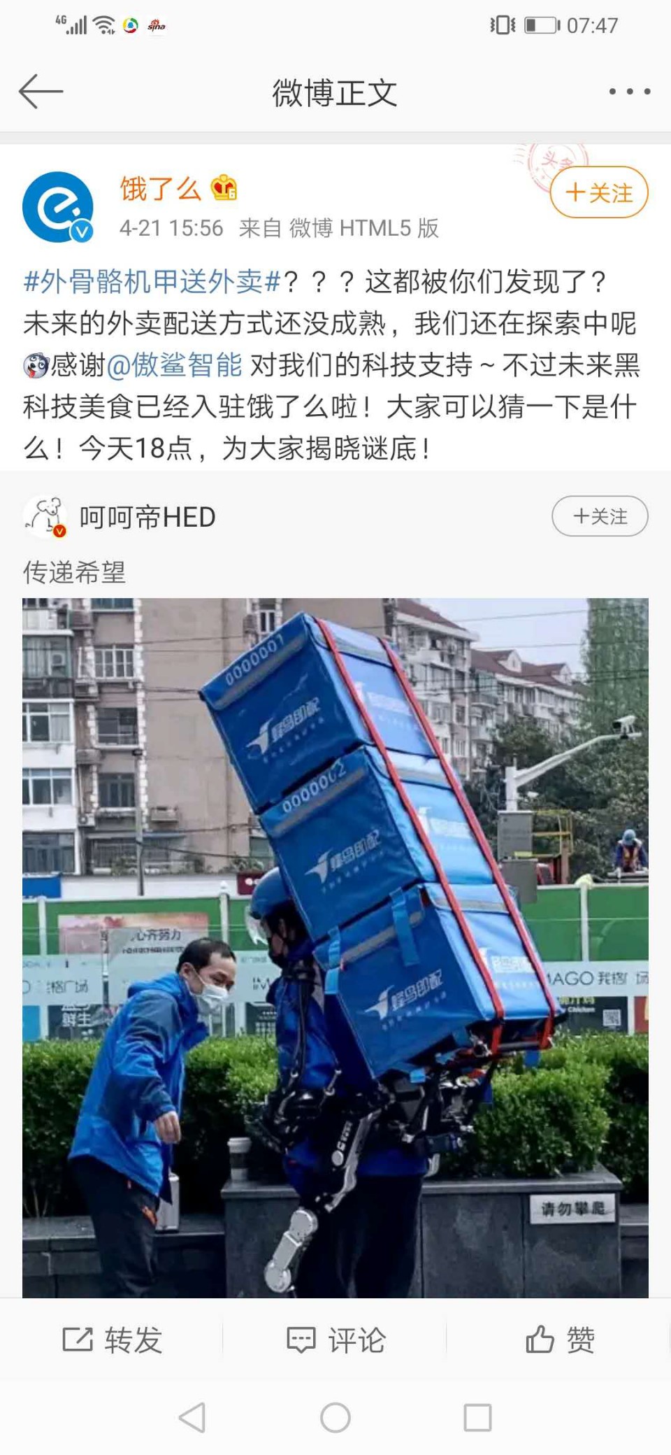 饿了么在回应中透露,外骨骼机甲由傲鲨智能支持。