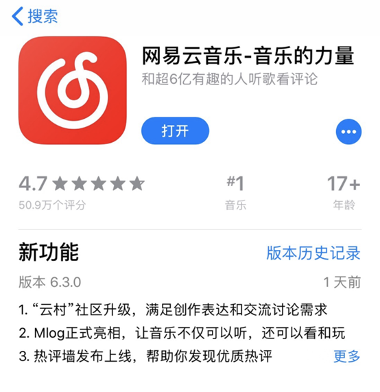 据下载界面显示,目前已升级到了v6.3.0版本,“云村”社区升级,Mlog正式亮相,热评墙发布上线,可帮助用户发现更多优质评论。